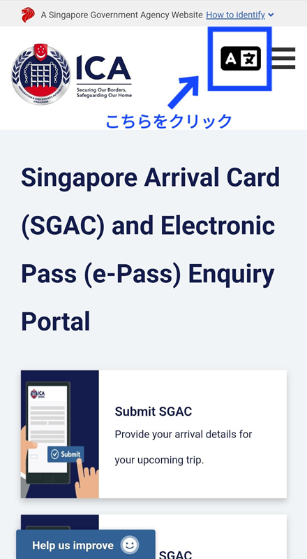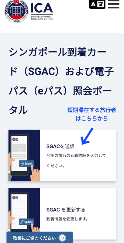 SG Arrival Cardの登録は、こちらのICA(シンガポール入国管理局)公式サイトから行えます。ウェブ版では、日本語にも対応しています。
