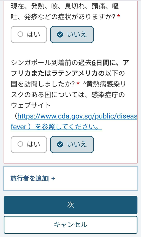 ここまで入力を終えると、体調面や訪問した国への問いに答え次に進みますが、代表者は「旅行者を追加」で家族のSGACをまとめて入力、申請することが可能です。お子さんの登録や夫婦での手続きが一括で完了させることができます。