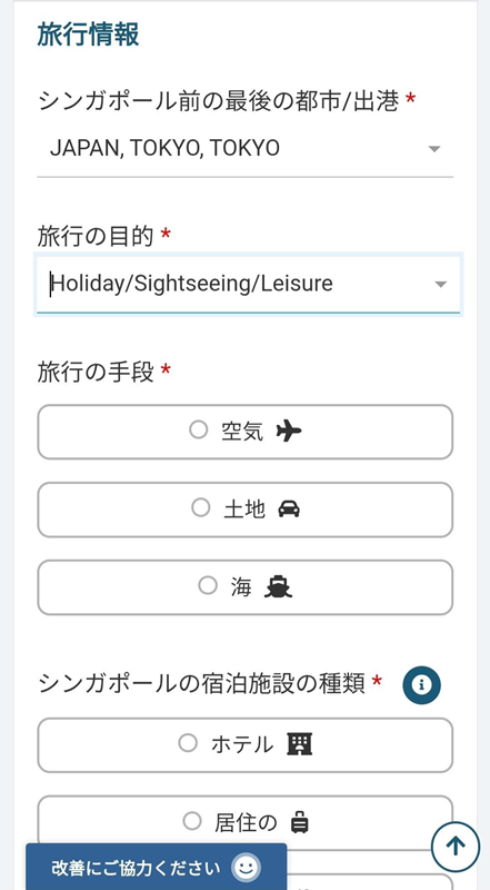 次の画面では、シンガポール到着前の最後の都市(空港)や旅行の目的、空路・陸路・海路などのシンガポール入国手段を入力します。
