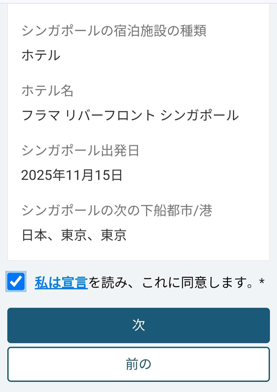 同じ画面のまま、続いて宿泊施設の種類(ホテル、レジデンシャル、その他)、ホテル名、シンガポールの出発日、出発後の到着予定空港(シティ)の詳細の入力をします。
