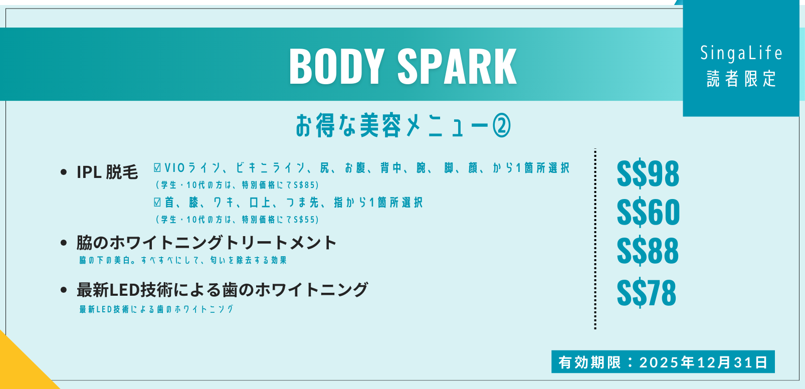| 🔶IPL 脱毛 ✅VIOライン、ビキニライン、尻、お腹、背中、腕、 脚、顔、から1か所選択 S$98 学生・10代の方は、特別価格にてS$85 ✅首、膝、ワキ、口上、つま先、指から1か所選択 S$60 学生・10代の方は、特別価格にてS$55 🔶脇のホワイトニングトリートメント S$88 脇の下の美白。すべすべにして、匂いを除去する効果 🔶最新LED技術による歯のホワイトニング S$78 無痛で歯の黄ばみをすっきり除去 ======================================= 🌟Special offer for SingaLife readers! Reasonable beauty treatment menu🌟 🔶IPL hair removal ✅Choose one part of the following: VIO line, bikini line, buttocks, stomach, back, arms, legs, or face S$98 Special price of S$85 for students and teenagers ✅Choose one part of the following: neck, knees, armpits, upper mouth, toes, or fingers S$60 Special price of S$55 for students and teenagers 🔶Underarm whitening treatment S$88 (Whitens underarms. Makes skin smooth and eliminates odor) 🔶Teeth whitening using the latest LED technology S$78 (Painless removal of yellowing of teeth) |