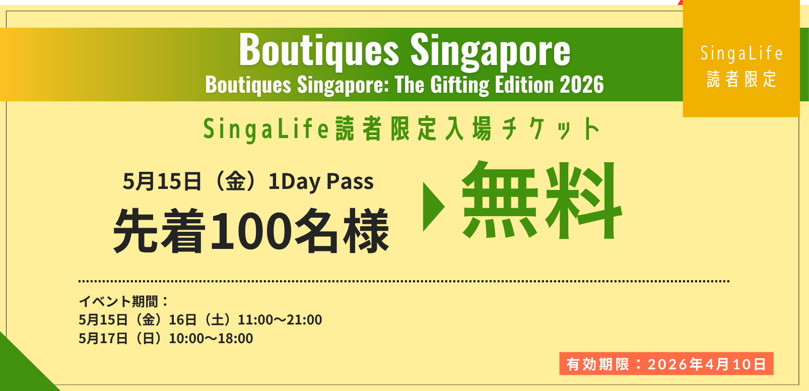 | ✨SingaLife読者限定! 5月15日(金)1Day Pass を無料で利用できるプロモコードを先着100名様にプレゼント! Boutiques Singapore:The Spring Summer Edition 2026 📅開催日時:5月15日(金)16日(土)11:00-21:00、17日(日)10:00-18:00 シンガポール最大級のショッピングイベントBoutiques Singapore。 3日間にわたり開催される Boutiques Singapore:The Spring Summer Edition 2026 では、300以上のデザイン性の高いブランドが集結。限定ローンチや没入型の体験も楽しめます。 レディース・メンズファッション、アクセサリー、ホーム、ライフスタイル、ビューティー、キッズ商品、F&B まで、多彩な新コレクションが勢ぞろい。 さらに、スナックやドリンクを楽しみながらくつろげる新しいラウンジコンセプトも用意されています。 ==================== 🌟Exclusive for SingaLife readers : The first 100 applicants will receive a promo code for a free 1-Day Pass for Friday, 15 May. Boutiques Singapore:The Spring Summer Edition 2026 Event Dates: 15 May (Fri) – 16 May (Sat) 11:00–21:00 17 May (Sun) 10:00–18:00 Boutiques Singapore, one of the largest shopping events in Singapore. At Boutiques Singapore: The Spring Summer Edition 2026, held over three days, more than 300 design-led brands will come together, offering exclusive launches and immersive experiences. Discover a wide range of new collections including women’s and men’s fashion, accessories, home and lifestyle items, beauty products, kids’ items, and F&B. In addition, a new lounge concept will be introduced where visitors can relax while enjoying snacks and drinks. |